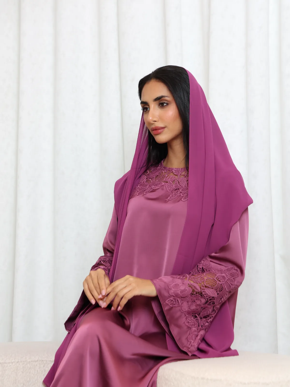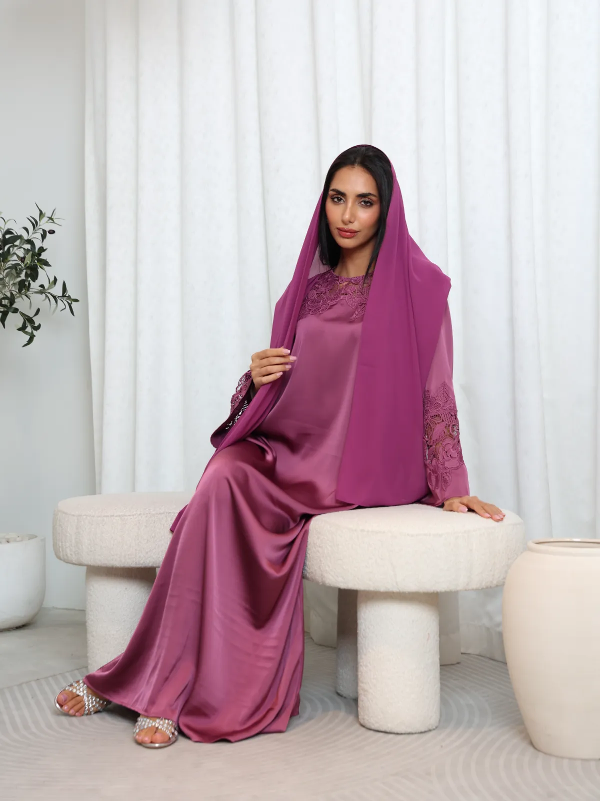 The rich, silky fabric drapes beautifully, while intricate embroidery details on the chest and sleeves add a refined touch of glamour. The matching headscarf completes the ensemble, ensuring a seamless and graceful look. Ideal for those who appreciate modest fashion with a hint of luxury, this piece is available in Medium and Large sizes to flatter all body shapes.